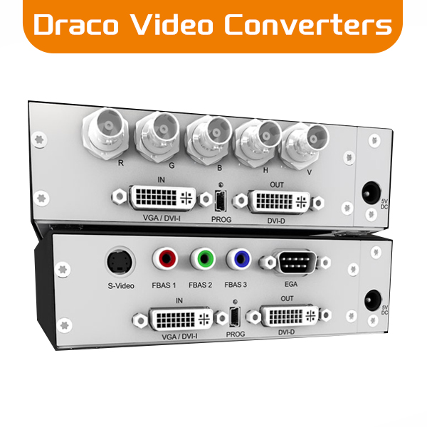 Draco视频转换器系列可将传统的RGB/VGA/媒体信号转换为数字DVI信号,从而延续传统设备的使用寿命,实现模拟VGA信号源与现代数字显示设备的无缝对接。
